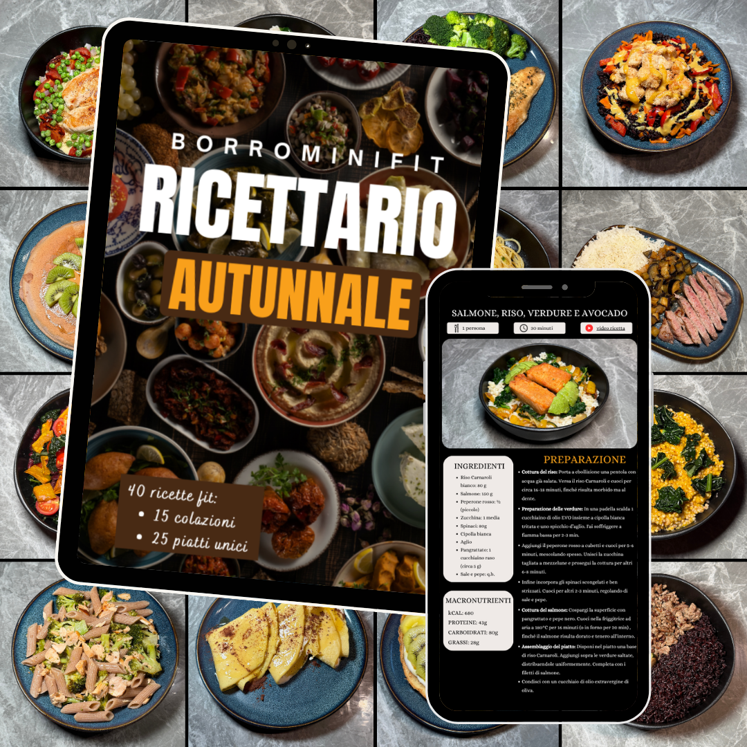 È un e‑book in formato PDF con 40 ricette nutrienti, leggere e veloci da preparare. Ogni piatto include ingredienti semplici, il video della preparazione passo per passo e la stima di calorie e macronutrienti.